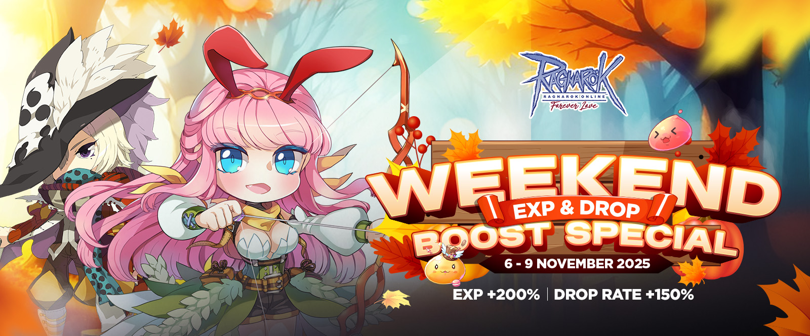 Hi, RO Mania~ Untuk menemani weekend kalian kali ini, tim ROFL telah menyiapkan event special Weekend EXP & Drop Boost Kamis, 6 November 2025 s/d Minggu, 9 November 2025 EXP RATE + 200% DROP + 150% NO DEATH PENALTY